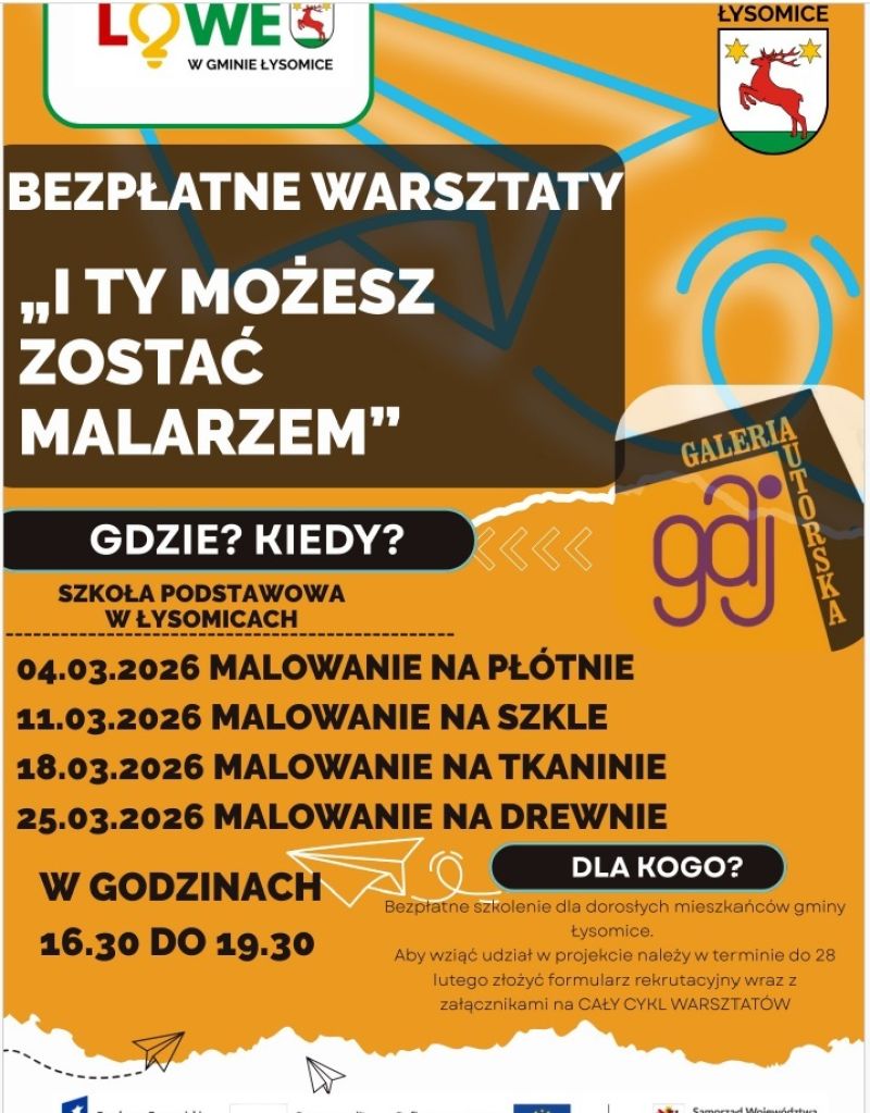 Cieszymy się, że LOWE ŁYSOMICE działa i cieszy się zainteresowaniem. Przed nami kolejne warsztaty-tym razem ciekawe zajęcia plastyczne dla dorosłych w małych grupach. Szczegóły w zalącznikach