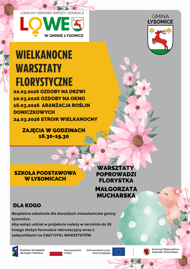 Gmina Łysomice zaprasza osoby dorosłe z obszaru LSR Ziemia Gotyku, w szczególności z Gminy Łysomice do uczestnictwa w projekcie pn. „LOWE w Gminie Łysomice” w ramach Programu Fundusze Europejskie dla Kujaw i Pomorza 2021-2027 współfinansowanego ze środków Europejskiego Funduszu Społecznego Plus w ramach Działania FEKP.07.03 Aktywizacja edukacyjna osób dorosłych – Instytucja Zarządzająca Programem - Zarząd Województwa Kujawsko-Pomorskiego.