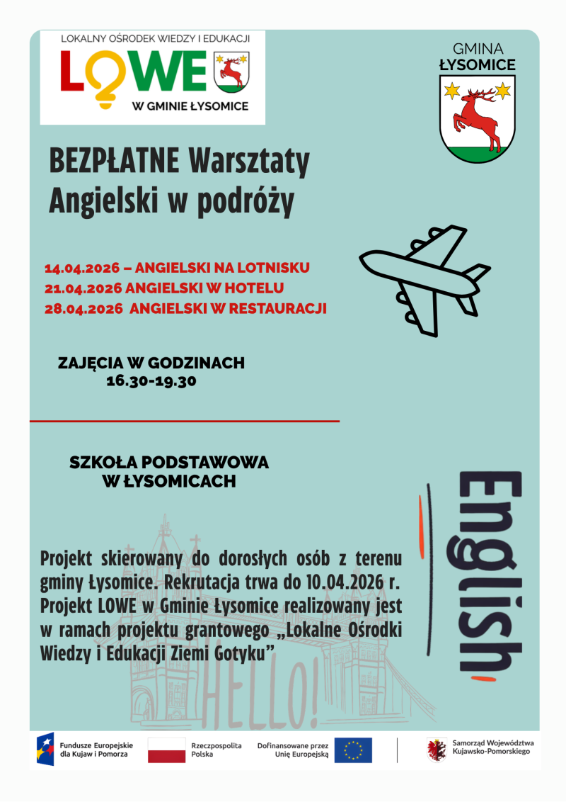 Gmina Łysomice zaprasza osoby dorosłe z obszaru LSR Ziemia Gotyku, w szczególności z Gminy Łysomice do uczestnictwa w projekcie pn. „LOWE w Gminie Łysomice” w ramach Programu Fundusze Europejskie dla Kujaw i Pomorza 2021-2027 współfinansowanego ze środków Europejskiego Funduszu Społecznego Plus w ramach Działania FEKP.07.03 Aktywizacja edukacyjna osób dorosłych – Instytucja Zarządzająca Programem - Zarząd Województwa Kujawsko-Pomorskiego.